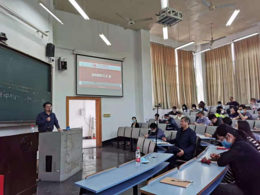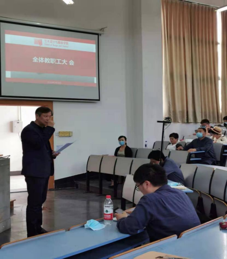 于B4-303、B3-102分别召开支部书记、系部主任工作例会和教职工大会。会议分别由党委书记詹俊主持。