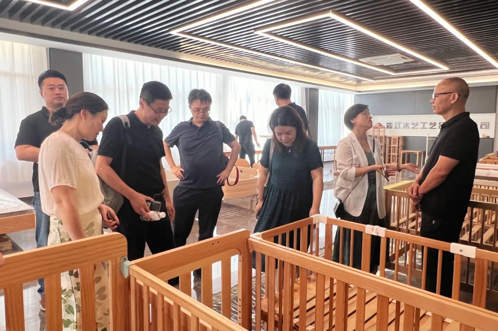工业设计教师团队先后走访了浙江童园玩具有限公司、浙江金马工艺品有限公司和浙江木艺工艺品有限公司。各企业负责人分别为校方介绍展示了企业的代表性产品,包括墙面游戏、康养益智玩具、婴儿床等木制产品,展现了木制玩具与电子科技、儿童启蒙、老年健康、银发经济等领域相互融合发展的丰富可能。在座谈会上,校方与企业负责人进一步围绕云和县木制玩具企业发展现状、校企合作需求以及云和研究院建设计划展开深入交流。